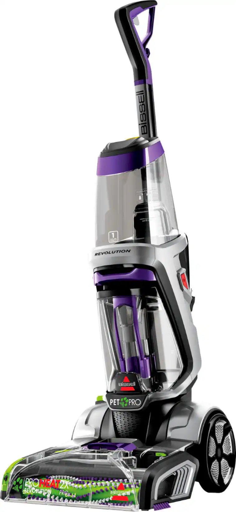 The BISSELL ProHeat 2X Revolution Pet Pro Plus Carpet Cleaner is designed to tackle tough pet messes, from mud to accidents. Its Pet Pro Cleanup System features a CleanShot pretreater for spots and stains, a 2-in-1 Pet Upholstery Tool to remove pet hair, stains, and odors, a trial-size BISSELL PET PRO OXY Urine Eliminator formula, and an EZ Clean Brush Roll Cover for easy maintenance.